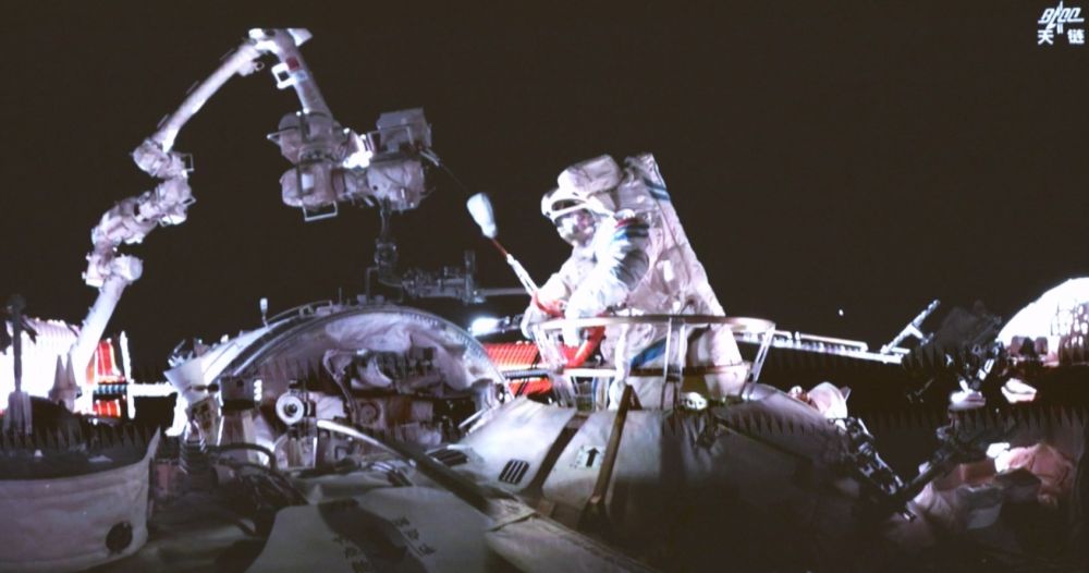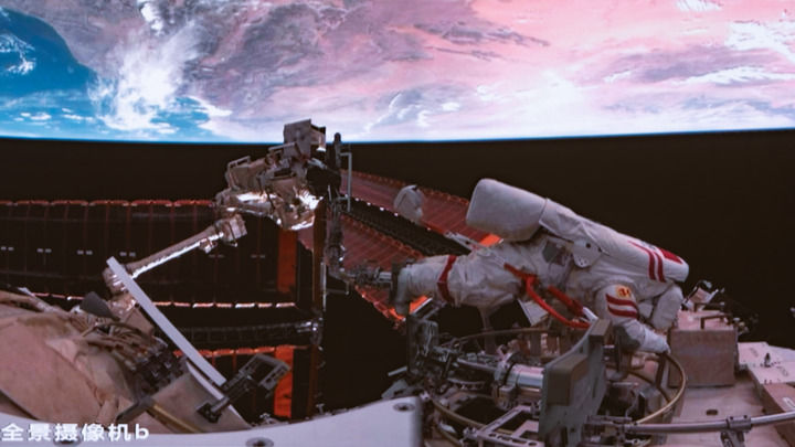 這是9月25日晚在北京航天飛行控制中心屏幕上拍攝的神舟二十號(hào)乘組航天員王杰在空間站組合體艙外作業(yè)的畫(huà)面。新華社記者李明剛 攝