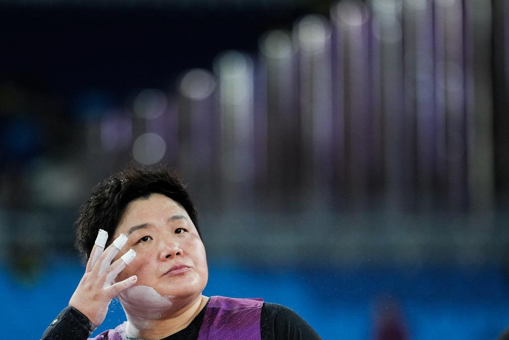 11月15日,廣東隊選手李美妮在女子攀石頒獎儀式前。