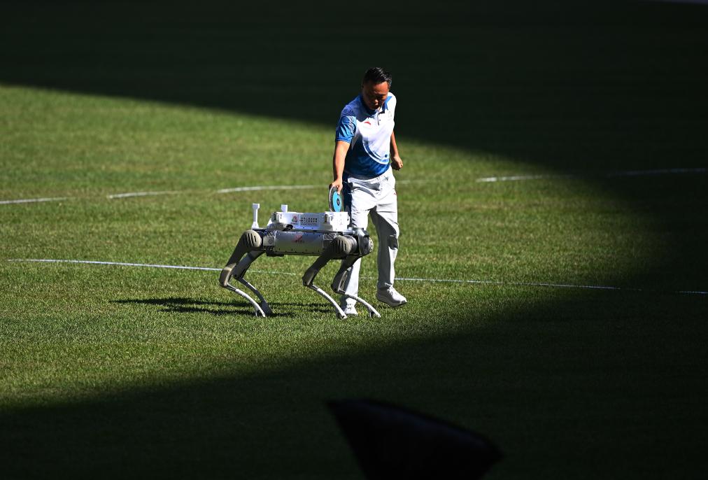 11月17日,在田徑項目賽事開始前的暖場活動中,機器人和吉祥物喜洋洋、樂融融在廣東奧體中心體育場賽跑。