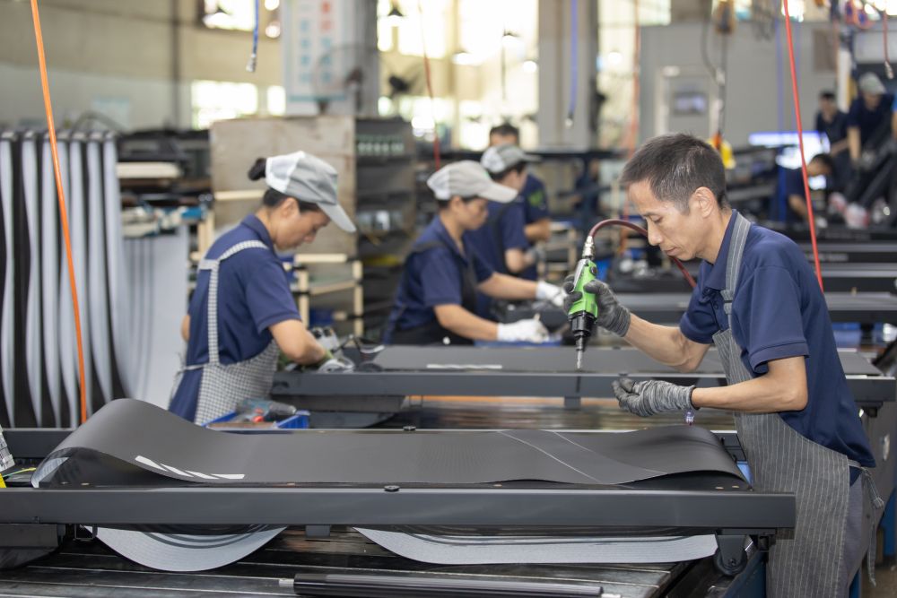 2025年9月12日,福建晉江一家體育器材工廠的工人在車間流水線上組裝跑步機(jī)。新華社發(fā)(連靜毅 攝)