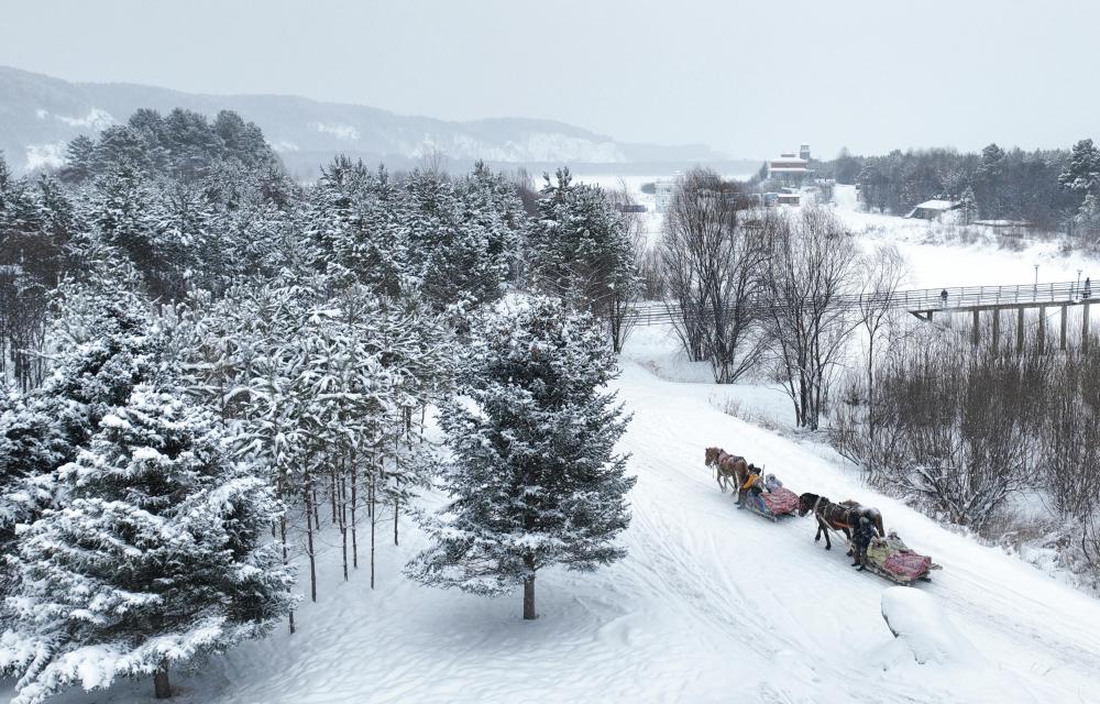 2024年11月27日,游客在黑龍江省漠河市北極村體驗(yàn)馬拉爬犁項目(無人機(jī)照片)。新華社發(fā)(徐率 攝)