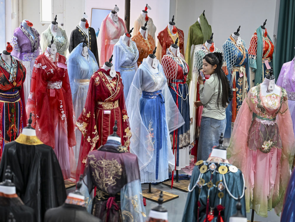 2025年6月17日,在山東省菏澤市曹縣有愛云倉漢服基地,工作人員直播推介漢服。新華社記者 徐嘉懿 攝