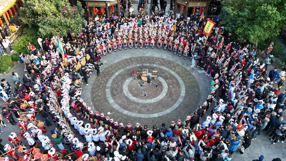 2024年11月30日,侗族群眾在貴州省黔東南苗族侗族自治州黎平縣肇興侗寨進(jìn)行文藝表演(無人機(jī)照片)。新華社發(fā)(王純亮 攝)