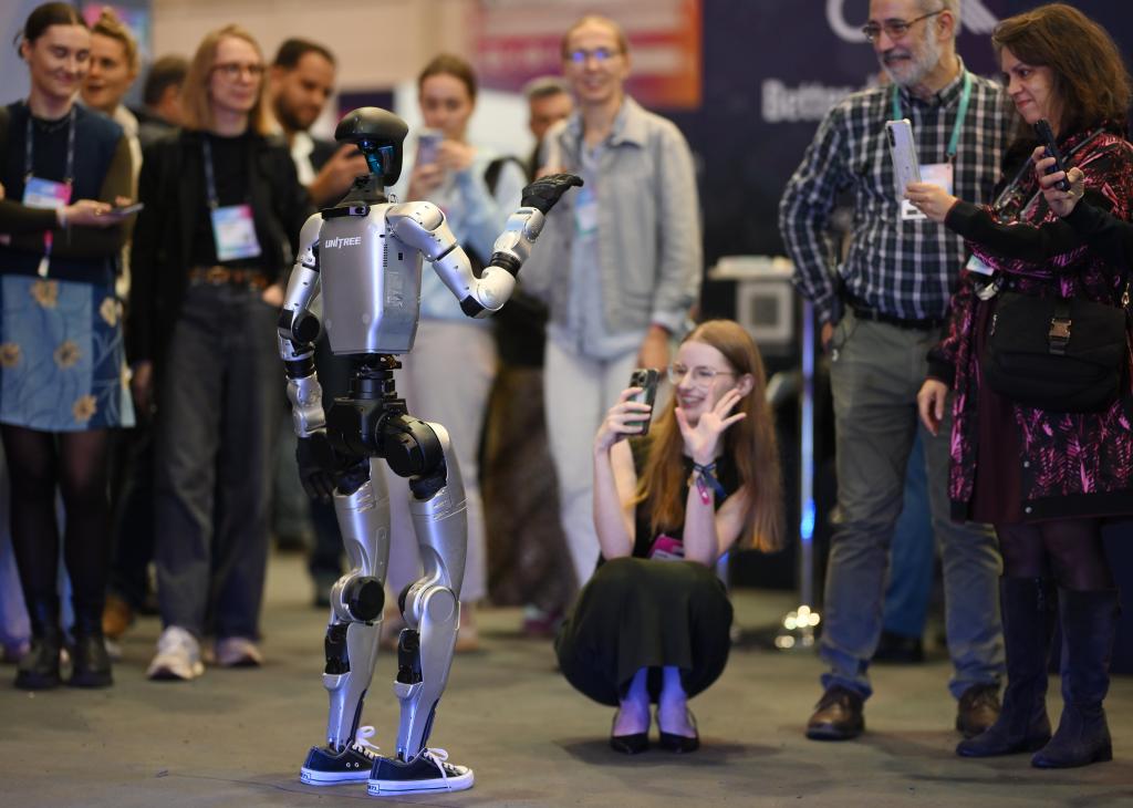2025年11月12日,在葡萄牙里斯本,中國企業(yè)宇樹科技的人形機(jī)器人和與會者在2025年網(wǎng)絡(luò)峰會現(xiàn)場互動。新華社發(fā)