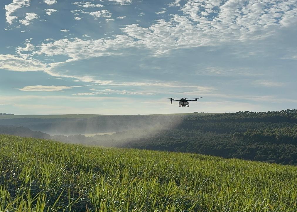 2025年3月25日,在南非夸祖魯-納塔爾省的方廷希爾莊園,中國農(nóng)用無人機(jī)為甘蔗林噴灑殺菌劑。新華社記者 白舸 攝
