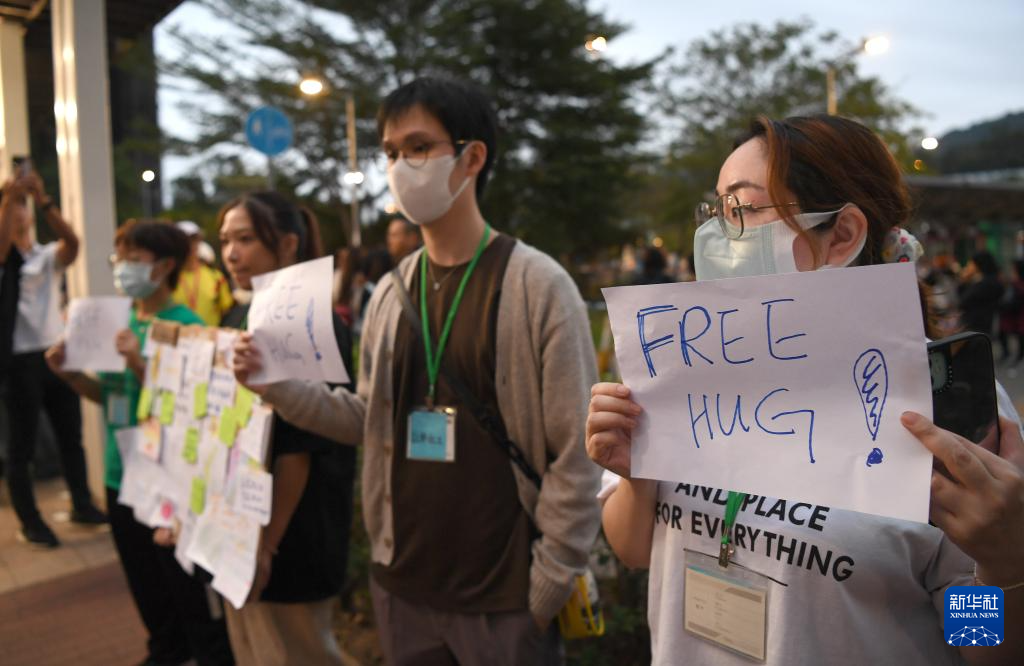 11月30日,義工在香港大埔廣福休憩處舉牌提供免費擁抱,提供心理疏導(dǎo)。新華社記者 陳鐸 攝