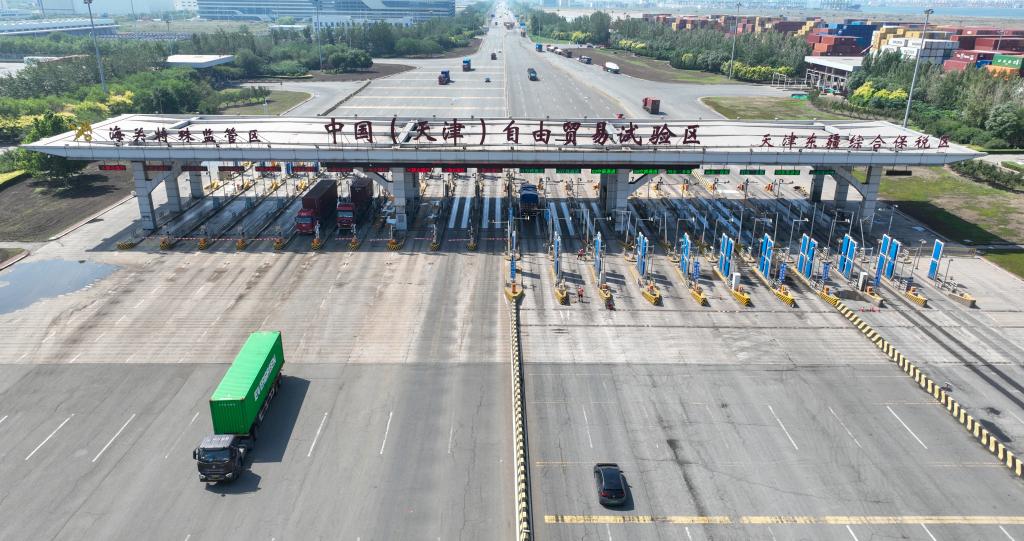 這是6月20日拍攝的天津自貿(mào)區(qū)天津港東疆片區(qū)入口處的中國(天津)自由貿(mào)易試驗區(qū)海關特殊監(jiān)管區(qū)入口(無人機照片)。新華社記者 孫凡越 攝