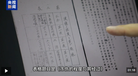 侵華日軍第七三一部隊罪證陳列館研究人員 譚天:這就是論文里的一張表格。表格題目是《凍傷的程度與其經(jīng)過》。第一度,發(fā)紅腫脹,第二度,出現(xiàn)水皰,第三度,壞死,含潰瘍。第三度,它這里頭寫五十到六十天,腳趾、手指脫落。無疑,這是經(jīng)過大量人體實(shí)驗(yàn),得到的所謂的數(shù)據(jù)。