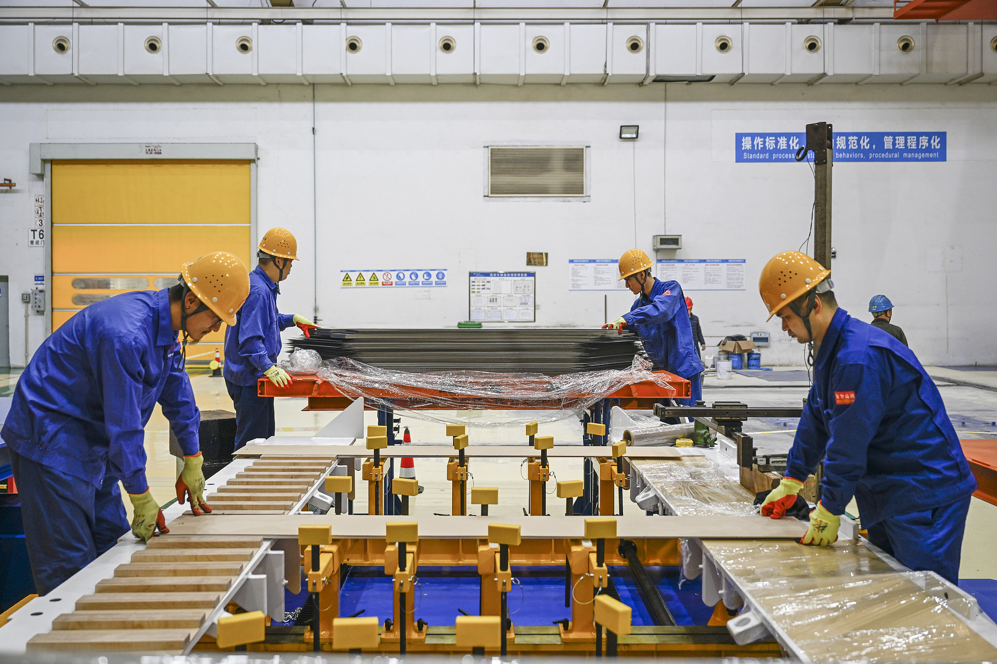 工人在組裝新能源變壓器硅鋼片