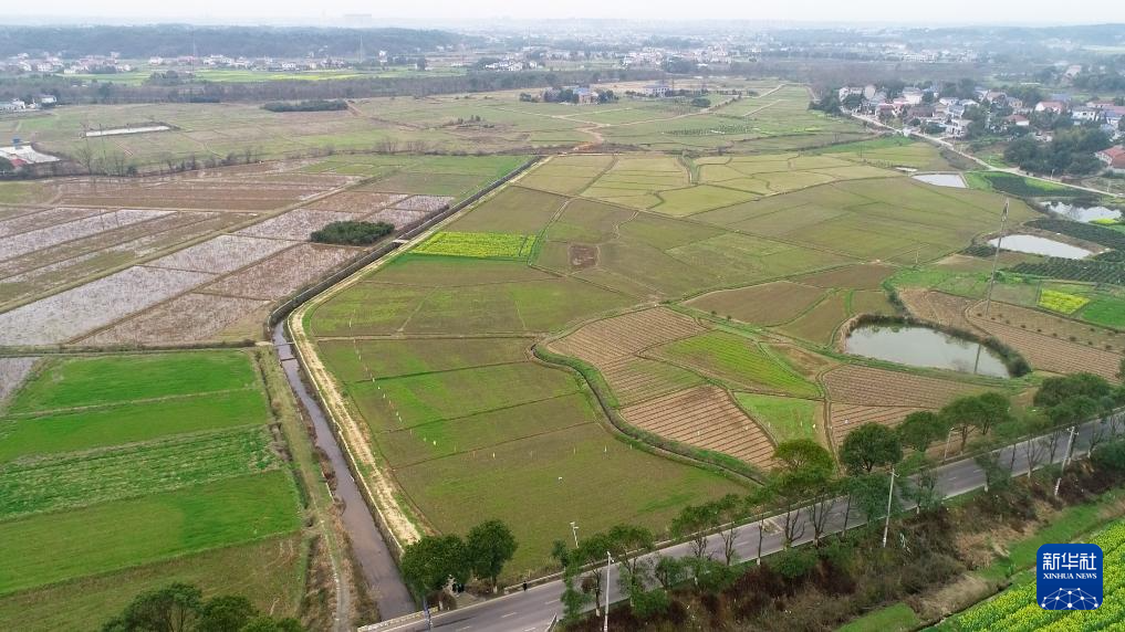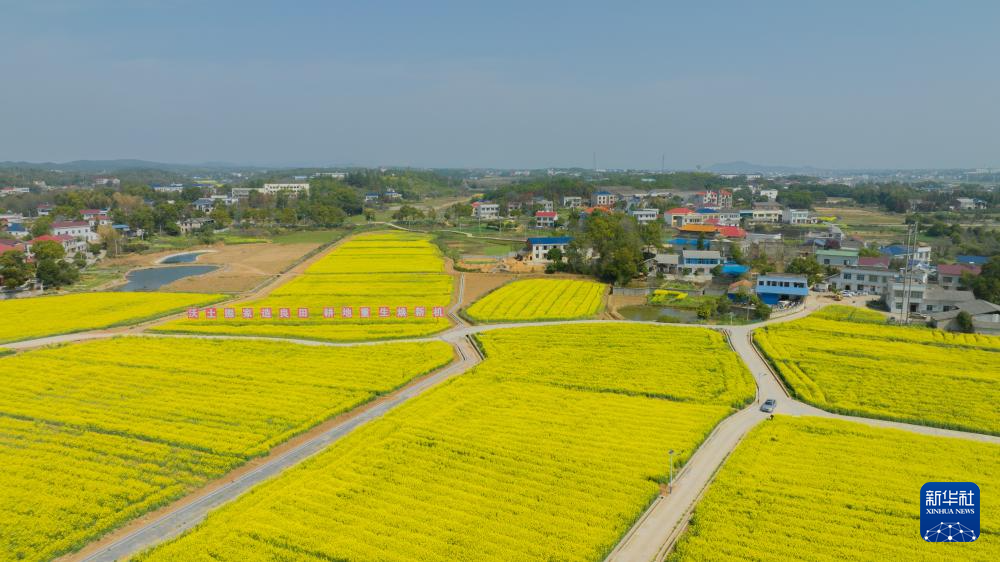 這是2023年3月10日拍攝的瀏陽市永安鎮(zhèn)豐裕村改良后耕地上的油菜花(無人機(jī)照片)。新華社發(fā)