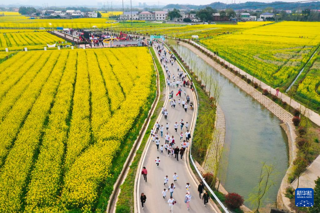 2024年3月22日,瀏陽市永安鎮(zhèn)豐裕村舉辦的油菜花節(jié),村民和游客參加花田鄉(xiāng)野跑活動(dòng)(無人機(jī)照片)。新華社發(fā)