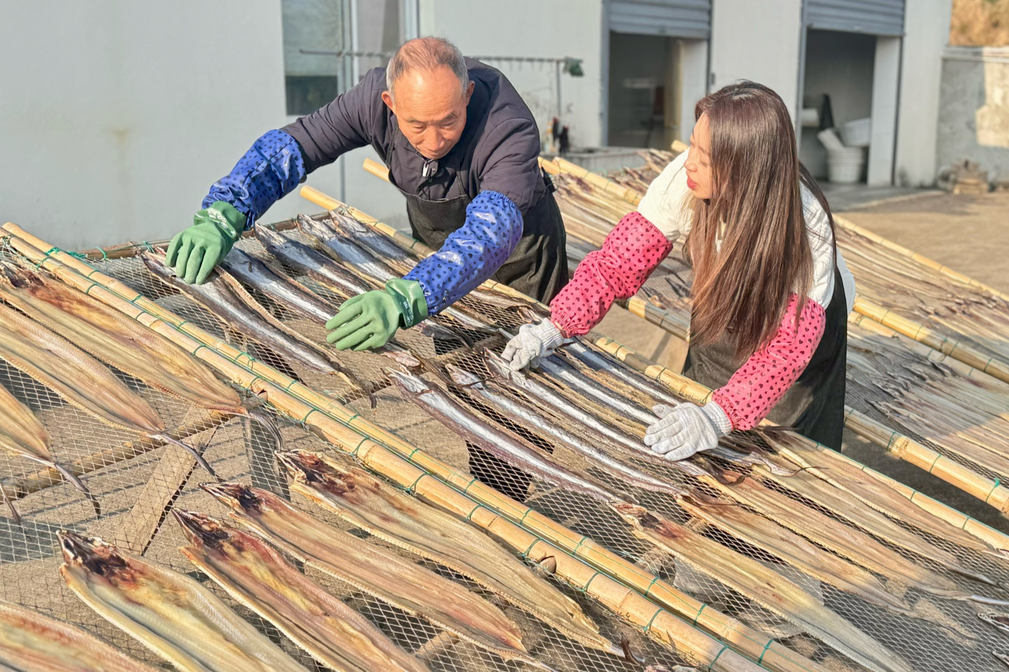 曬魚鲞是海島群眾的傳統(tǒng)習(xí)俗。近日,在當(dāng)?shù)剡h(yuǎn)近聞名的魚鲞專業(yè)村——茅洋鄉(xiāng)文洋村的文山一品魚鲞廠里,工人們正趁著晴好天氣忙著翻曬魚鲞,空氣中彌漫著咸鮮的海風(fēng)氣息。選鮮、處理、腌制、晾曬的傳統(tǒng)工序與現(xiàn)代化流水線并行運(yùn)轉(zhuǎn),廠長鮑財(cái)富一邊指導(dǎo)工人包裝,一邊向記者介紹:“我從事這行已經(jīng)30余年了,多的時(shí)候日產(chǎn)量能有一二千斤,一般都是批量賣給飯店?!?/p>