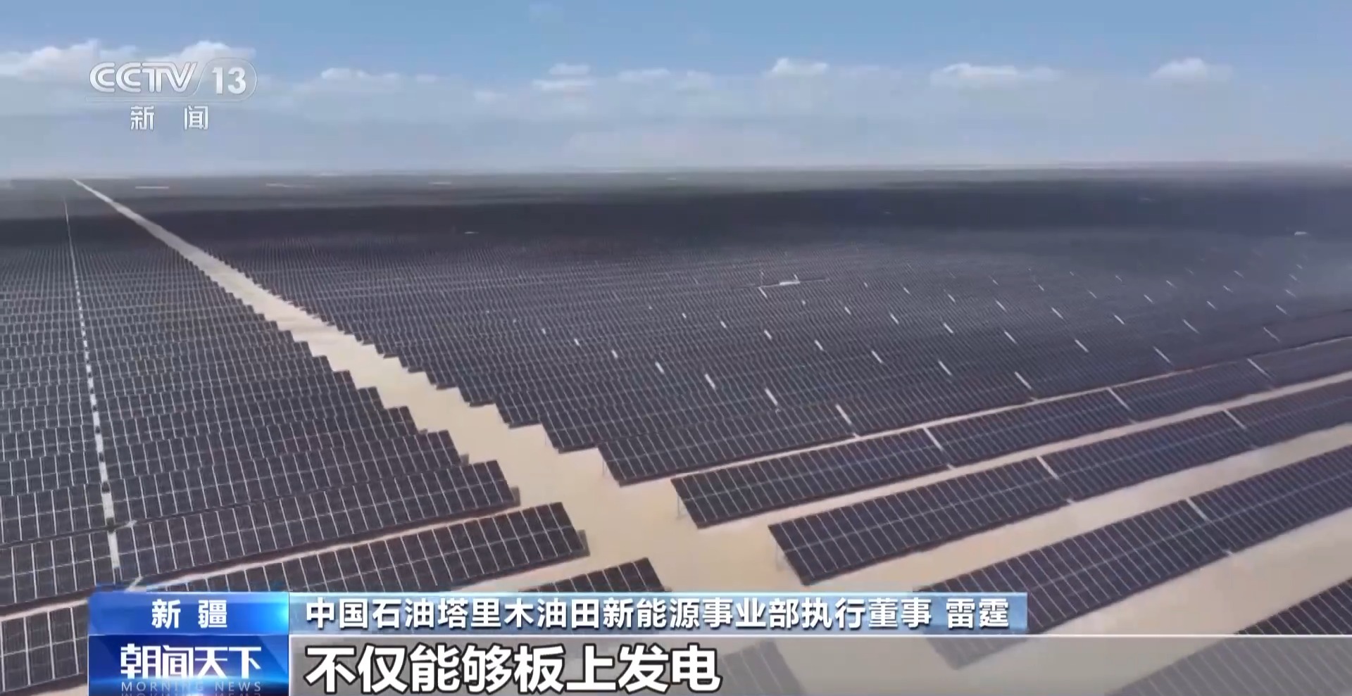 中國石油塔里木油田新能源事業(yè)部執(zhí)行董事 雷霆:我們通過在流沙上建設(shè)光伏板,不僅能在板上發(fā)電,還降低了風(fēng)速,營造了陰涼,在板下鋪設(shè)滴灌帶進(jìn)行生物治沙,一舉多贏。預(yù)計到明年,我們的裝機(jī)將超過400萬千瓦。