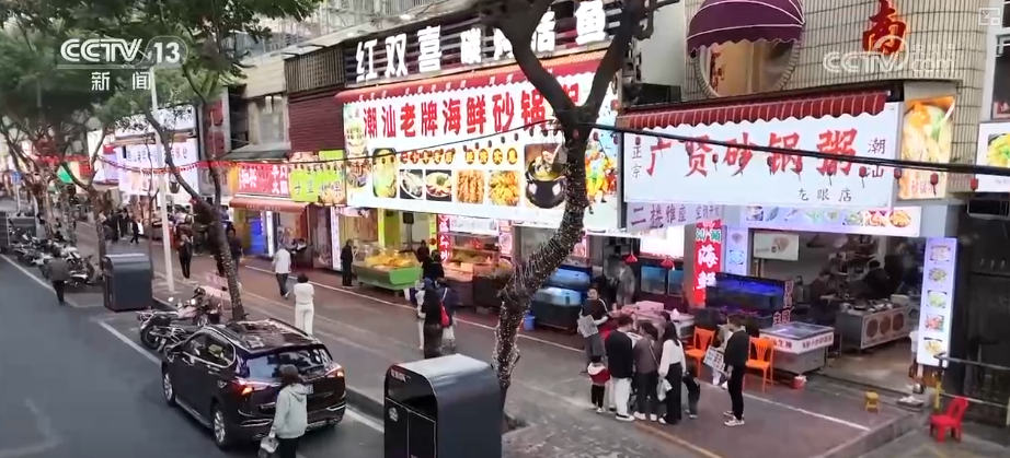 第一站來到汕頭著名的美食集聚地龍眼南路美食街,這里全長470米,涵蓋潮汕特色美食、茶飲甜品、創(chuàng)意餐飲等。游客不僅可以吃上腸粉、粿條湯等傳統(tǒng)早餐,還能品嘗鹵鵝、生腌等招牌菜肴,以及反沙芋頭、腐乳雞翅等特色小吃。這條24小時不打烊的美食街吸引了來自全國各地的游客。