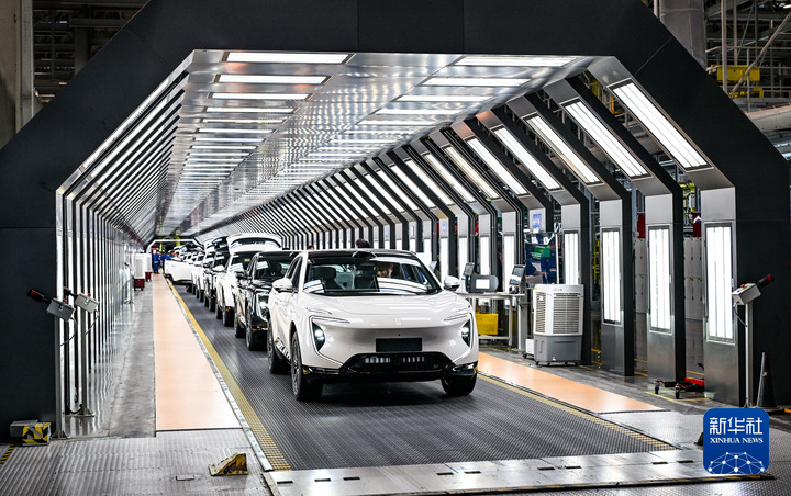 2025年9月18日在位于重慶市渝北區(qū)的長(zhǎng)安汽車(chē)數(shù)智工廠總裝車(chē)間拍攝的即將下線的新能源汽車(chē)。新華社記者 王全超 攝