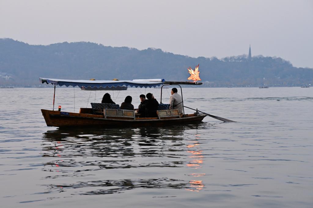 “馬燈福氣船”成為冬季杭州西湖夜游的一抹亮色。新華社記者段菁菁 攝