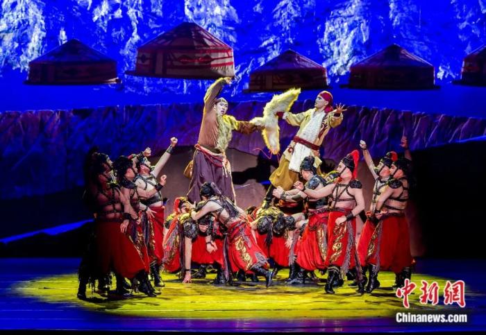 2023年4月7日,新疆烏魯木齊,原創(chuàng)歌舞劇《瑪納斯》作為首屆新疆文化藝術(shù)節(jié)優(yōu)秀劇目在新疆人民劇場上演。中新社記者 劉新 攝