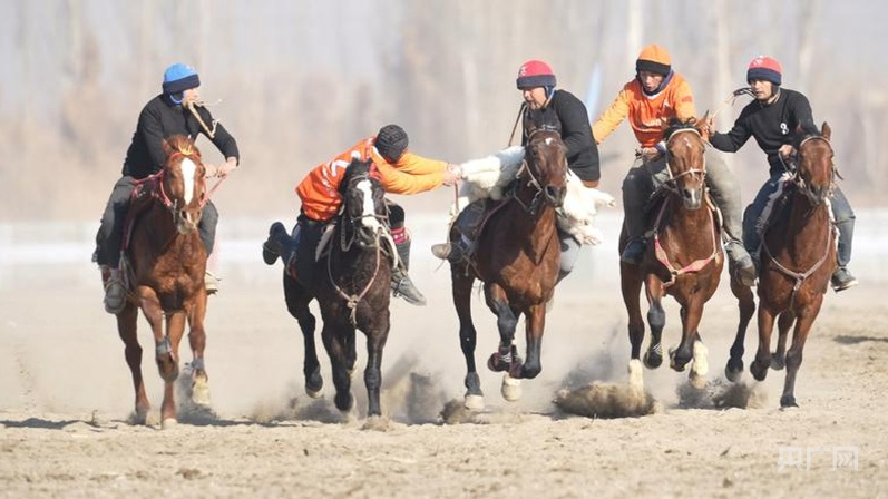 在麥蓋提縣,首屆“刀郎杯”全疆刁羊賽馬爭霸賽的賽場上,騎手們聞令而動,盡顯精湛馬背技藝 (央廣網(wǎng)發(fā) 吾斯曼·麥麥提 攝)