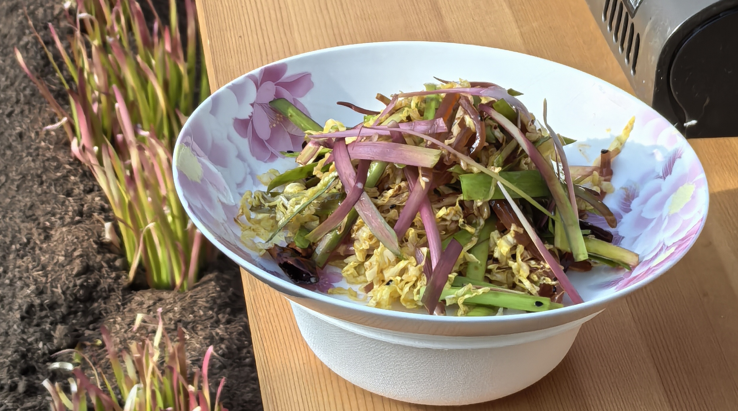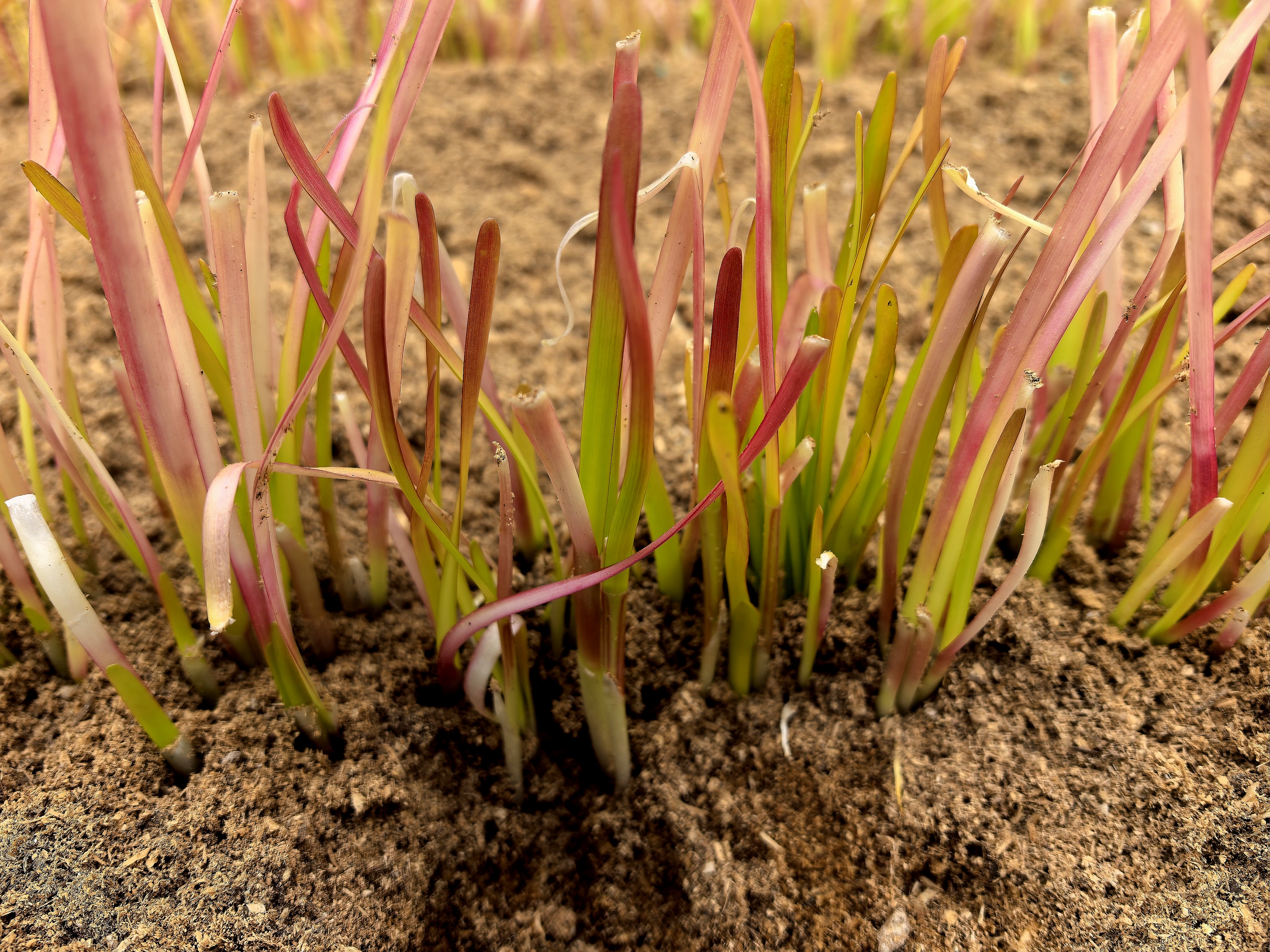 這樣的顏色并非品種天生,而是產(chǎn)于一套復(fù)雜細(xì)致的栽培技藝。在冬季,用特殊的基質(zhì)層層覆蓋韭菜地,精細(xì)調(diào)控掀蓋的時(shí)間、厚度來控制溫度和光照條件,使其在不同植株部位呈現(xiàn)出豐富的色彩。