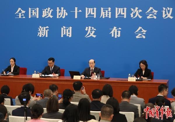 3月3日,北京,全國政協(xié)十四屆四次會議新聞發(fā)布會在人民大會堂一層新聞發(fā)布廳舉行。大會新聞發(fā)言人劉結(jié)一(右二)向中外媒體介紹本次大會有關(guān)情況并回答記者提問。中青報·中青網(wǎng)記者 陳劍/攝