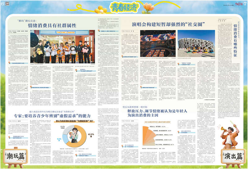 消費(fèi)端彰顯“青春經(jīng)濟(jì)”活力。青年消費(fèi)者追求的不再是單一產(chǎn)品,而是更加注重情感共鳴、文化認(rèn)同和價值表達(dá),由“性價比”轉(zhuǎn)向“心價比”。中青報及中青校媒記者調(diào)研發(fā)現(xiàn),61.2%的受訪青年會為了釋放壓力、調(diào)節(jié)情緒而為演出花錢,62.5%的受訪青年認(rèn)為購買潮玩盲盒是在為情緒買單。國研新經(jīng)濟(jì)研究院創(chuàng)始院長朱克力認(rèn)為,年輕一代的消費(fèi)正變得越來越多元化、個性化,充滿文化感、設(shè)計感和科技感?!斑@些特性與社會躍遷密切相關(guān)?!?/p>