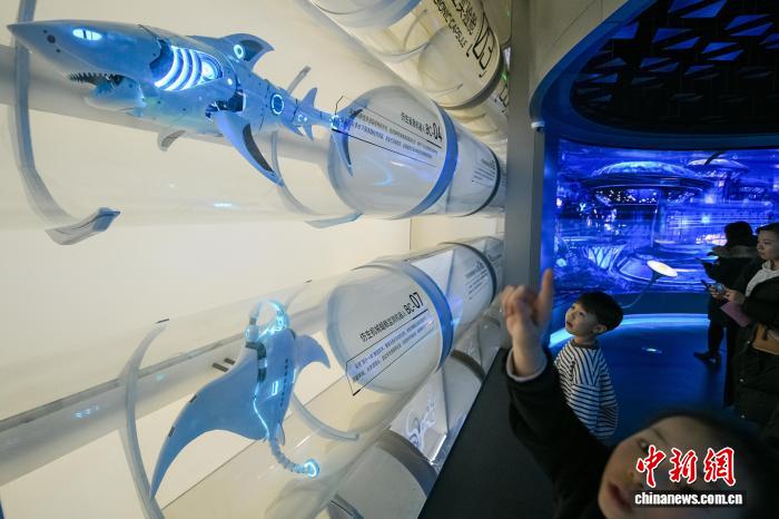 1月30日,游客在位于天津?yàn)I海新區(qū)的國家海洋博物館“未來海洋”展廳參觀各種海洋仿生機(jī)器人。 中新社記者 佟郁 攝