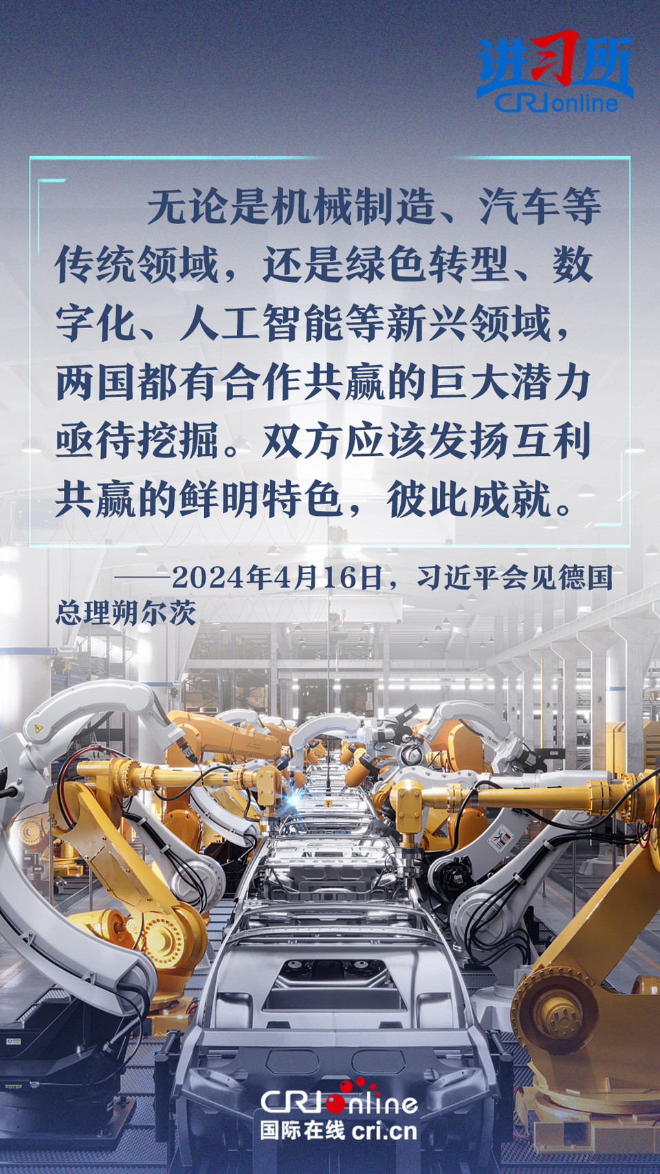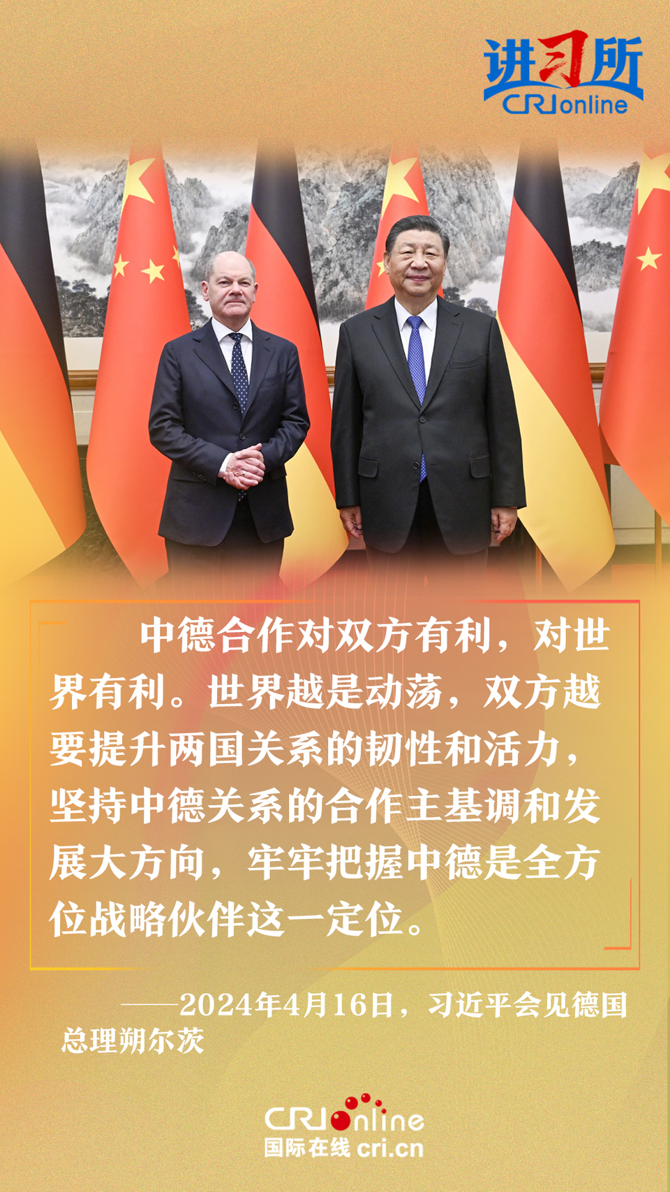4月16日上午,中國國家主席習近平在北京釣魚臺國賓館會見了德國總理朔爾茨。習近平指出,中德合作對雙方有利,對世界有利。世界越是動蕩,雙方越要提升兩國關系的韌性和活力。中德是世界第二、第三大經濟體,鞏固和發(fā)展中德關系的意義超越雙邊關系范疇,對亞歐大陸乃至整個世界都有重要影響。兩國要從長遠和戰(zhàn)略角度看待和發(fā)展雙邊關系,攜手為世界注入更多穩(wěn)定性和確定性。