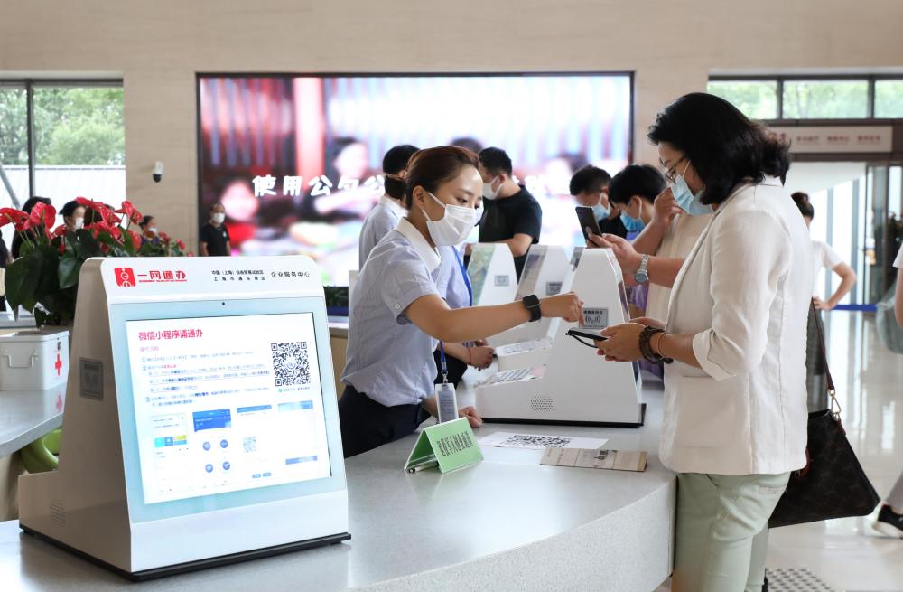 上海市浦東新區(qū)2019年率先啟動“一業(yè)一證”改革。這是在浦東新區(qū)企業(yè)服務(wù)中心辦事大廳,工作人員指導(dǎo)市民通過手機小程序辦理一網(wǎng)通辦業(yè)務(wù)(2020年8月4日攝)。