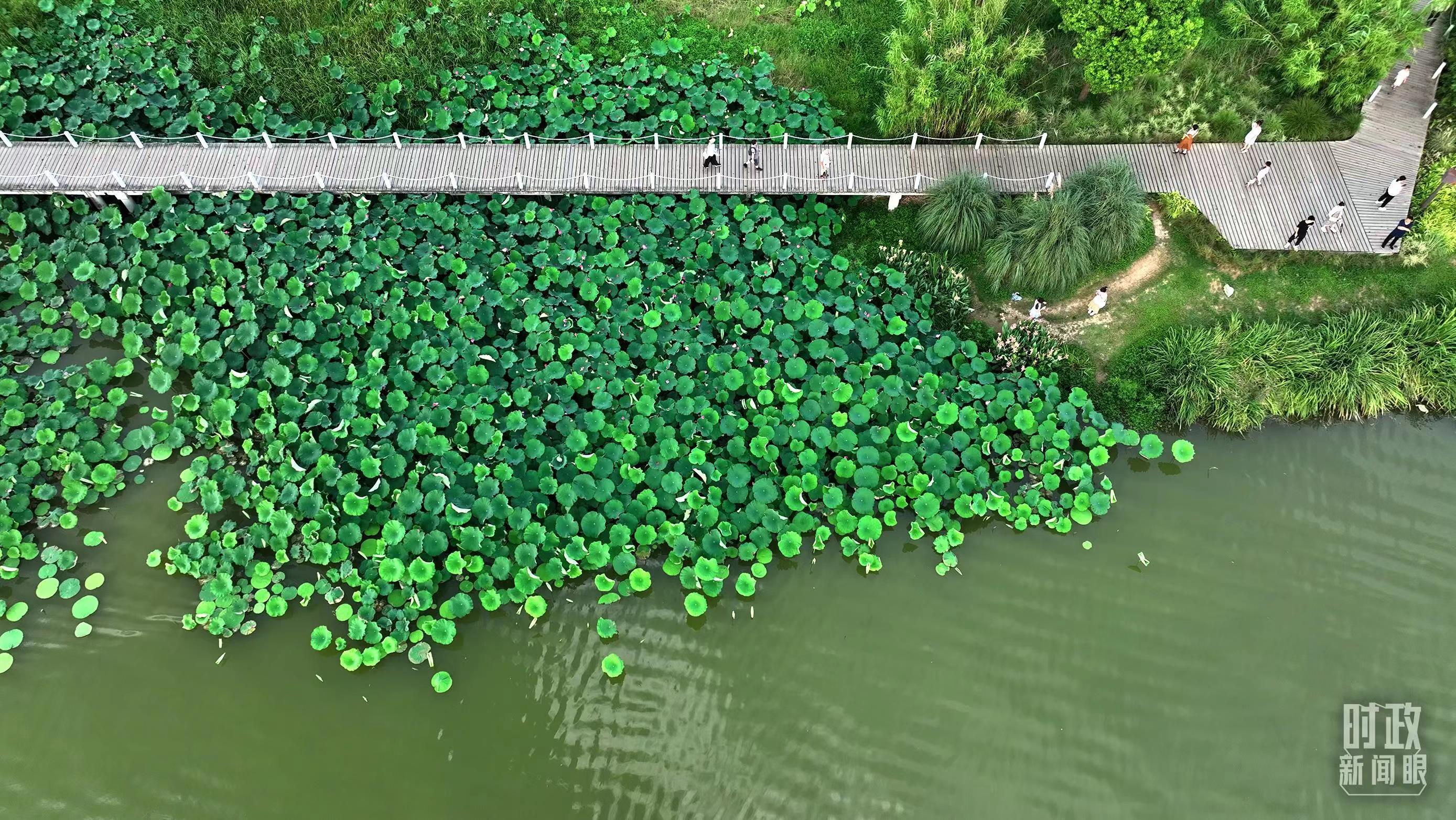 陜西漢中天漢濕地公園內(nèi),游人穿行,荷影婆娑。(總臺記者劉海濤拍攝)