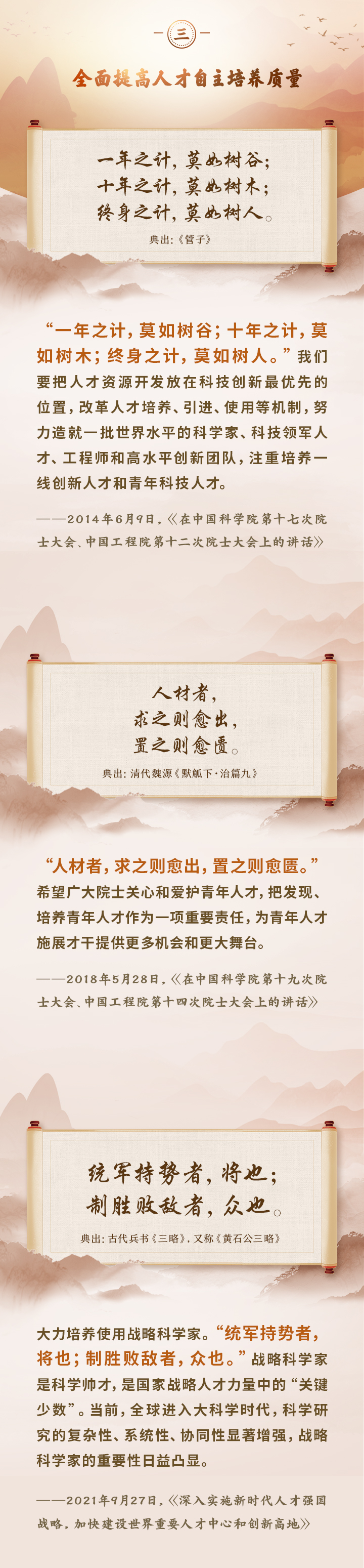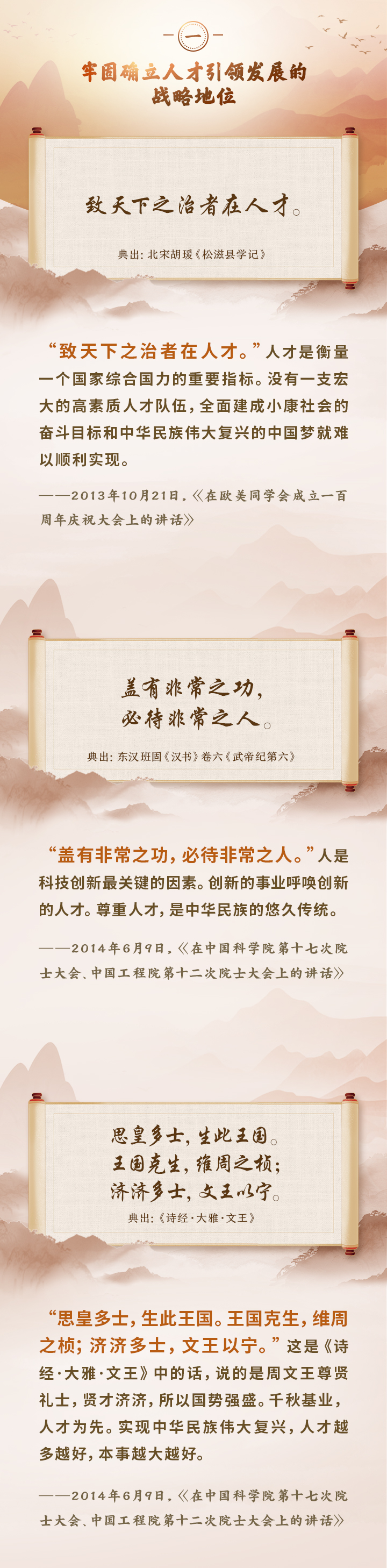 編者按:培養(yǎng)造就大批德才兼?zhèn)涞母咚刭|(zhì)人才,是國家和民族長遠發(fā)展大計。黨的十八大以來,習近平總書記圍繞人才工作發(fā)表一系列重要論述,立意高遠,內(nèi)涵豐富,思想深刻,深刻回答了為什么建設人才強國、什么是人才強國、怎樣建設人才強國的重大理論和實踐問題。在這些重要論述中,總書記精妙運用古代典籍、經(jīng)典名句,以古喻今、啟迪思想、激蕩精神,讓我們一起來學習!