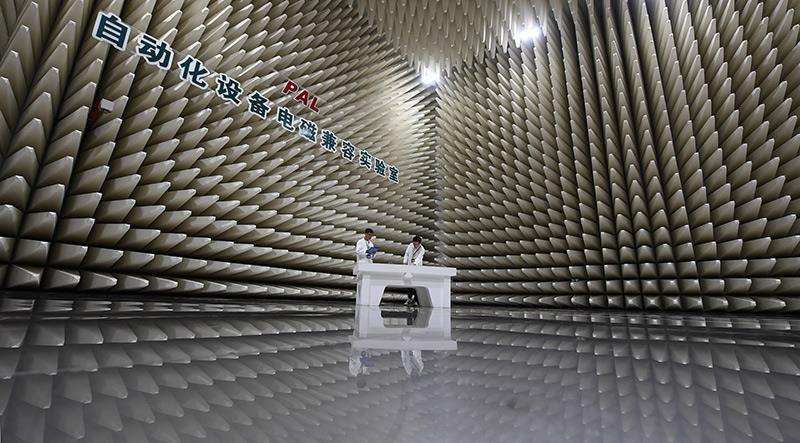 △2023年7月7日,在南瑞集團(tuán)有限公司自動(dòng)化設(shè)備電磁兼容實(shí)驗(yàn)室,科研人員在進(jìn)行輻射發(fā)射實(shí)驗(yàn)準(zhǔn)備工作。