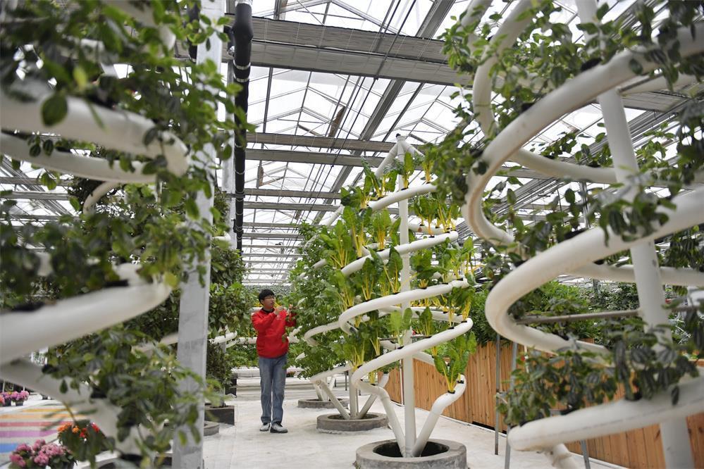 △2023年5月13日,在河北曲周縣育苗產(chǎn)業(yè)園,苗樂(lè)園科技小院的學(xué)生在查看無(wú)土栽培蔬菜。