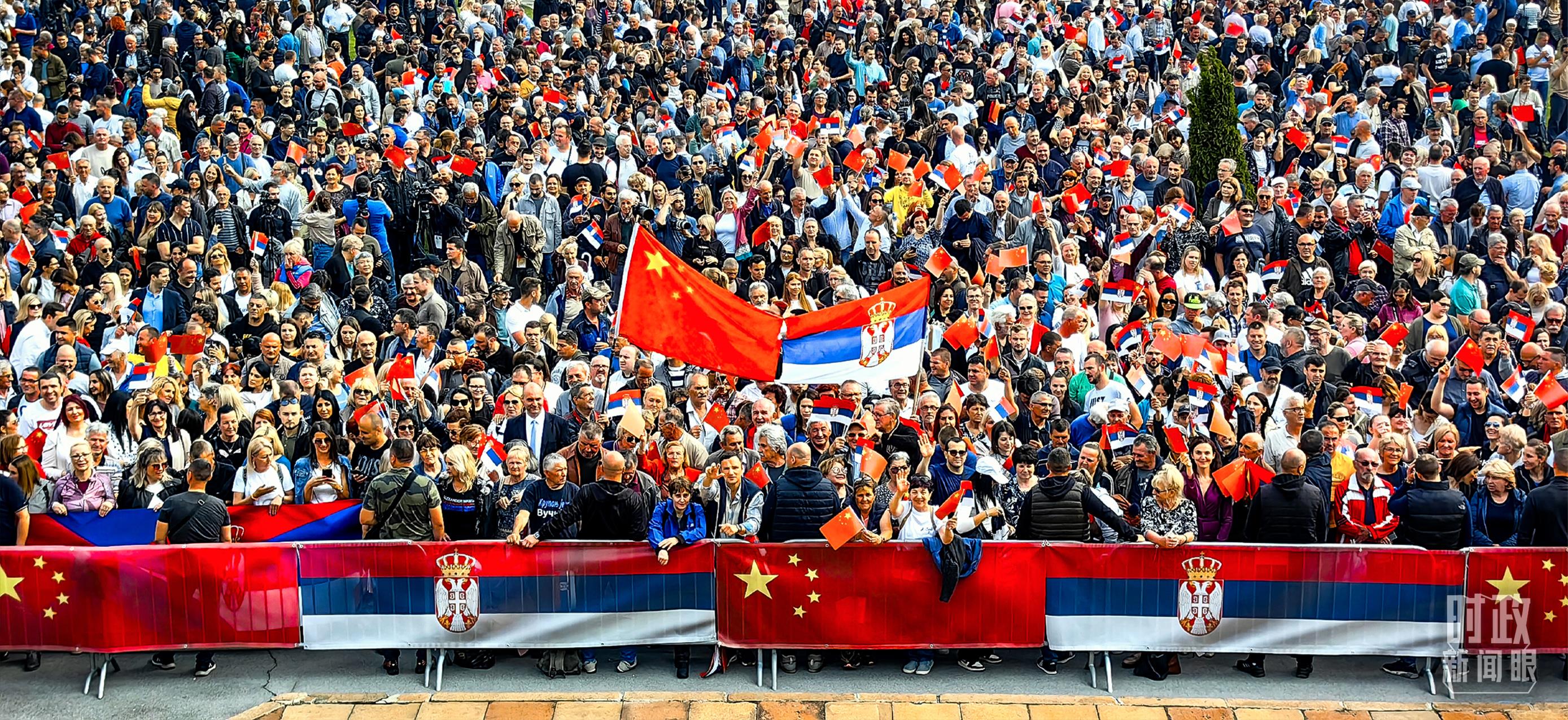 當(dāng)天的歡迎儀式結(jié)束后,武契奇總統(tǒng)陪同習(xí)主席來到政府大廈平臺。大廈廣場上,一萬五千名塞爾維亞民眾揮舞中塞兩國國旗,對習(xí)主席表示最熱烈的歡迎。