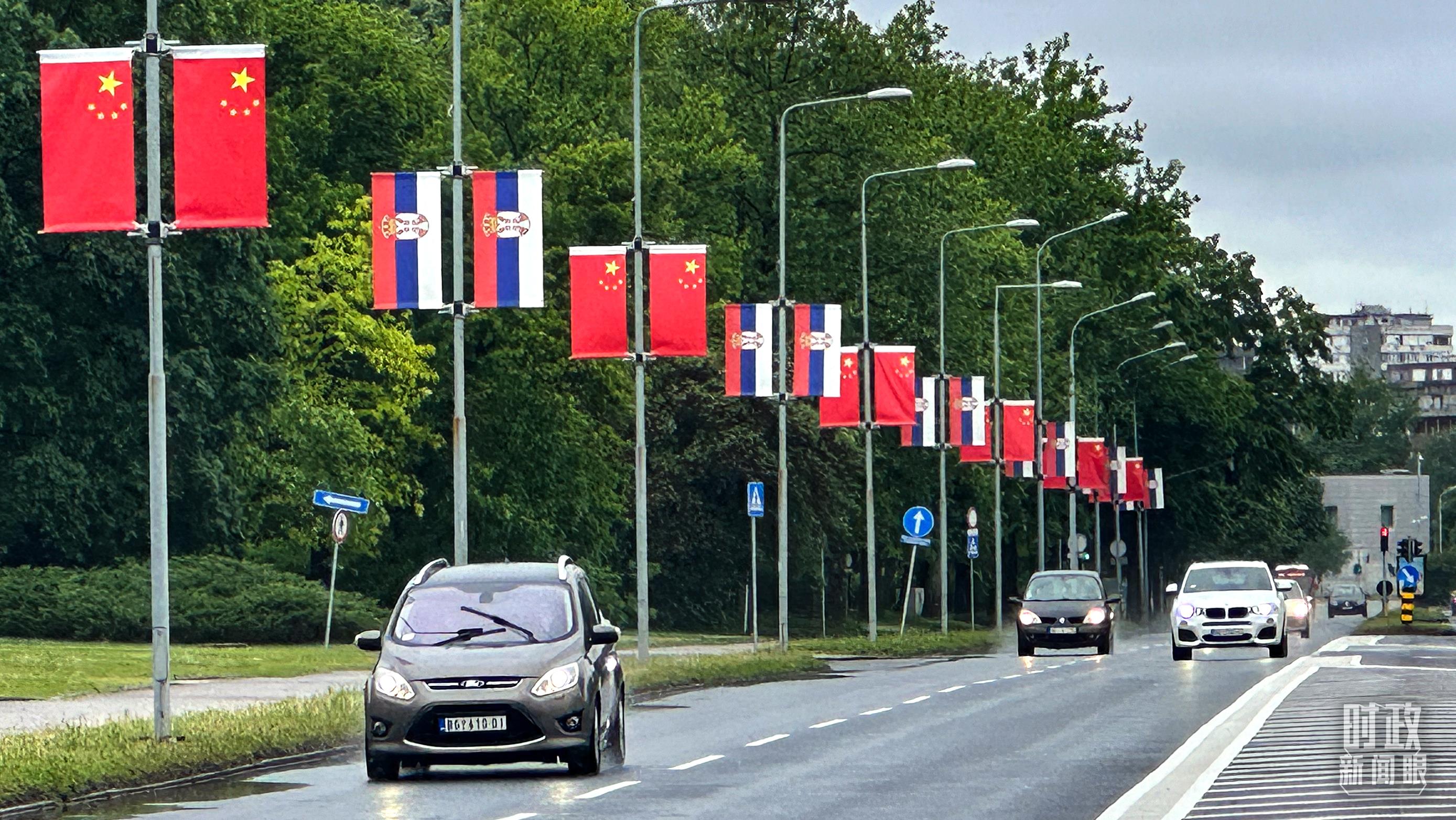 貝爾格萊德的主要街道掛滿五星紅旗,隨風(fēng)飄揚。(總臺央視記者范一鳴拍攝)