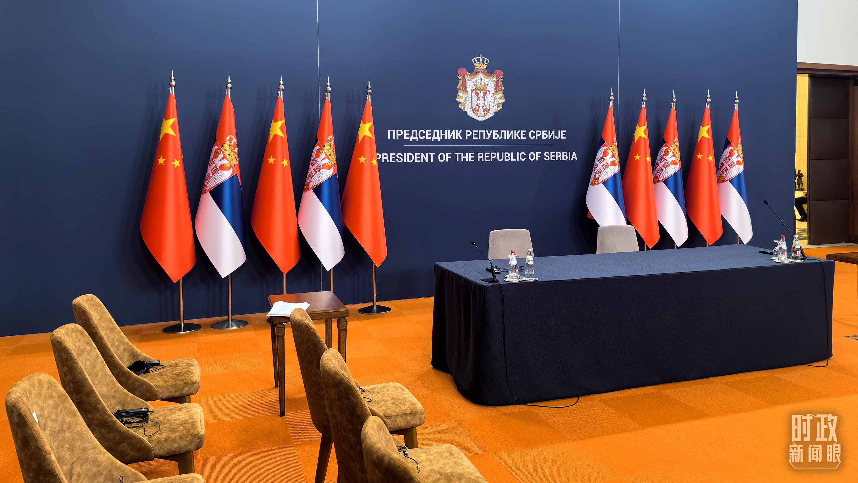 習(xí)主席同武契奇總統(tǒng)會談后共同會見記者,這是會見開始前的現(xiàn)場。(總臺央視記者鄂介甫拍攝)