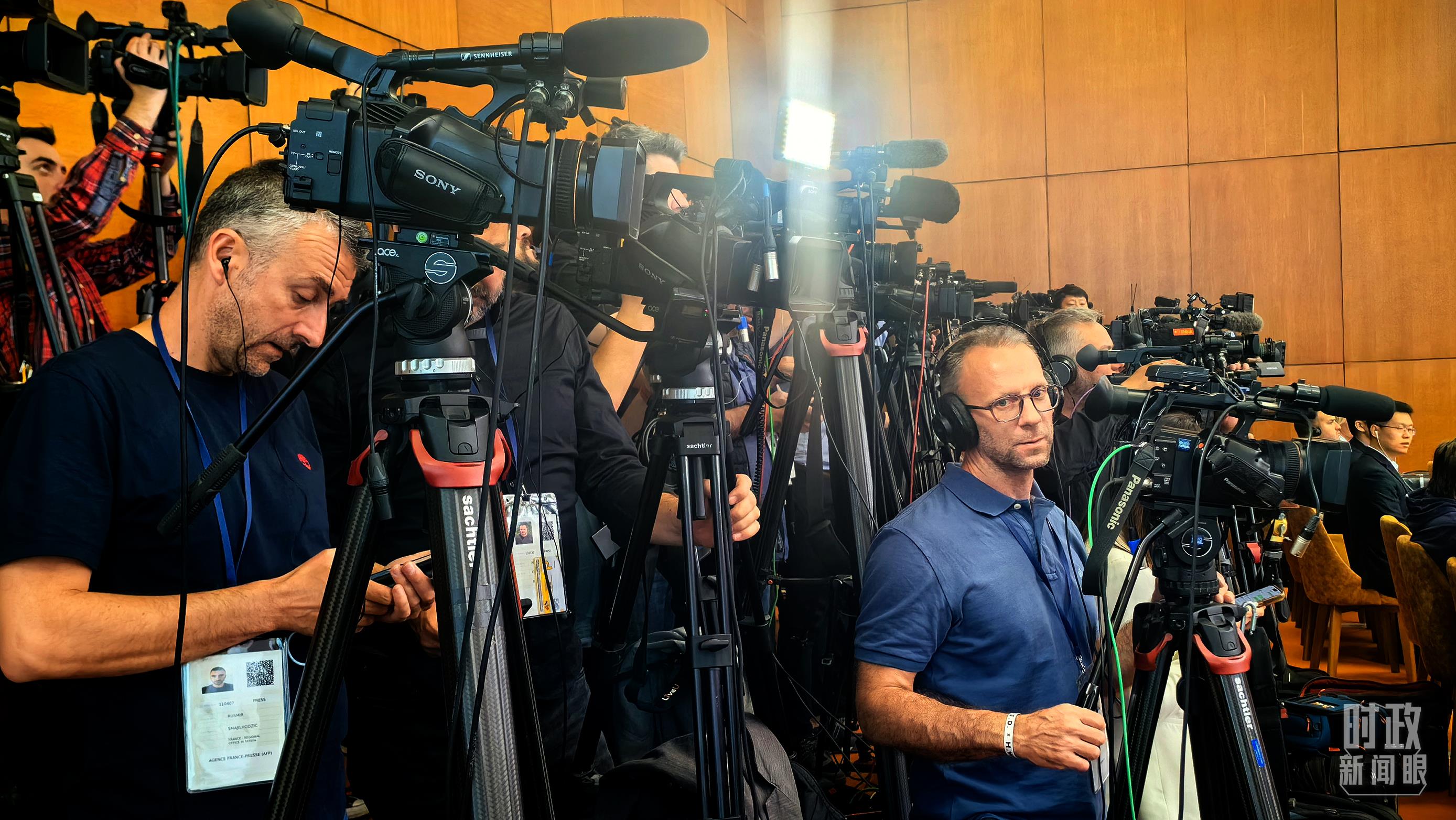 習(xí)主席同武契奇總統(tǒng)會談后共同會見記者,會見現(xiàn)場記者云集。(總臺央視記者荊偉拍攝)