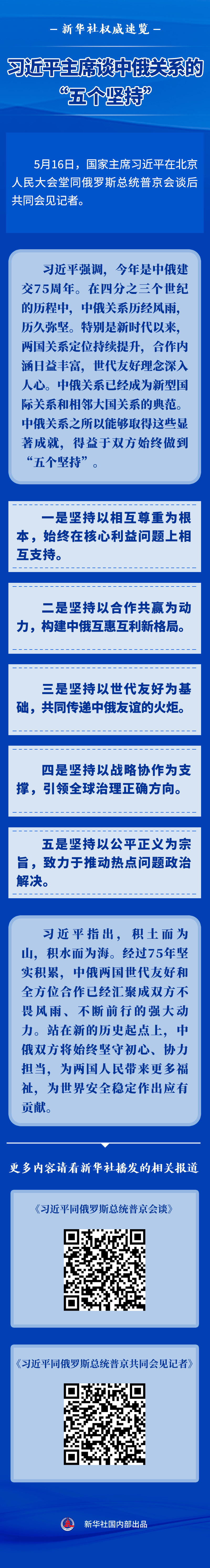 5月16日,國家主席習(xí)近平在北京人民大會堂同俄羅斯總統(tǒng)普京會談后共同會見記者。習(xí)主席談到中俄關(guān)系的“五個堅(jiān)持”。