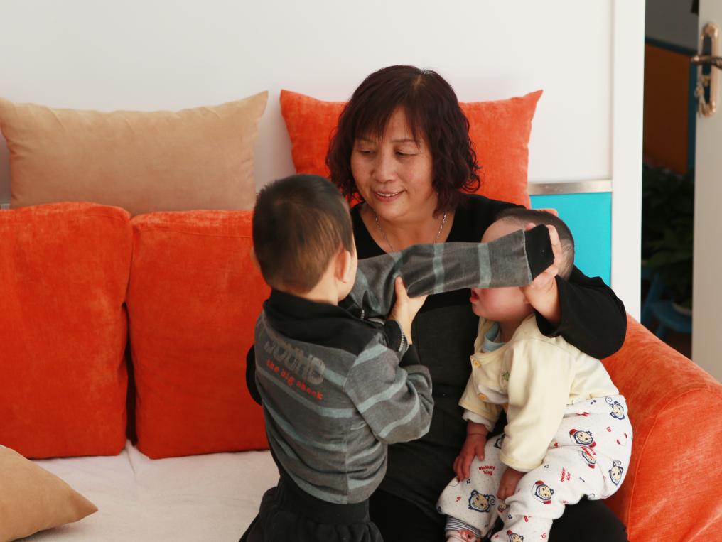2017年11月3日,內(nèi)蒙古呼和浩特市兒童福利院里,“愛(ài)心媽媽”景鳳英抱著兩個(gè)孩子。新華社記者 王婧嬙 攝