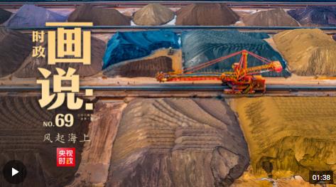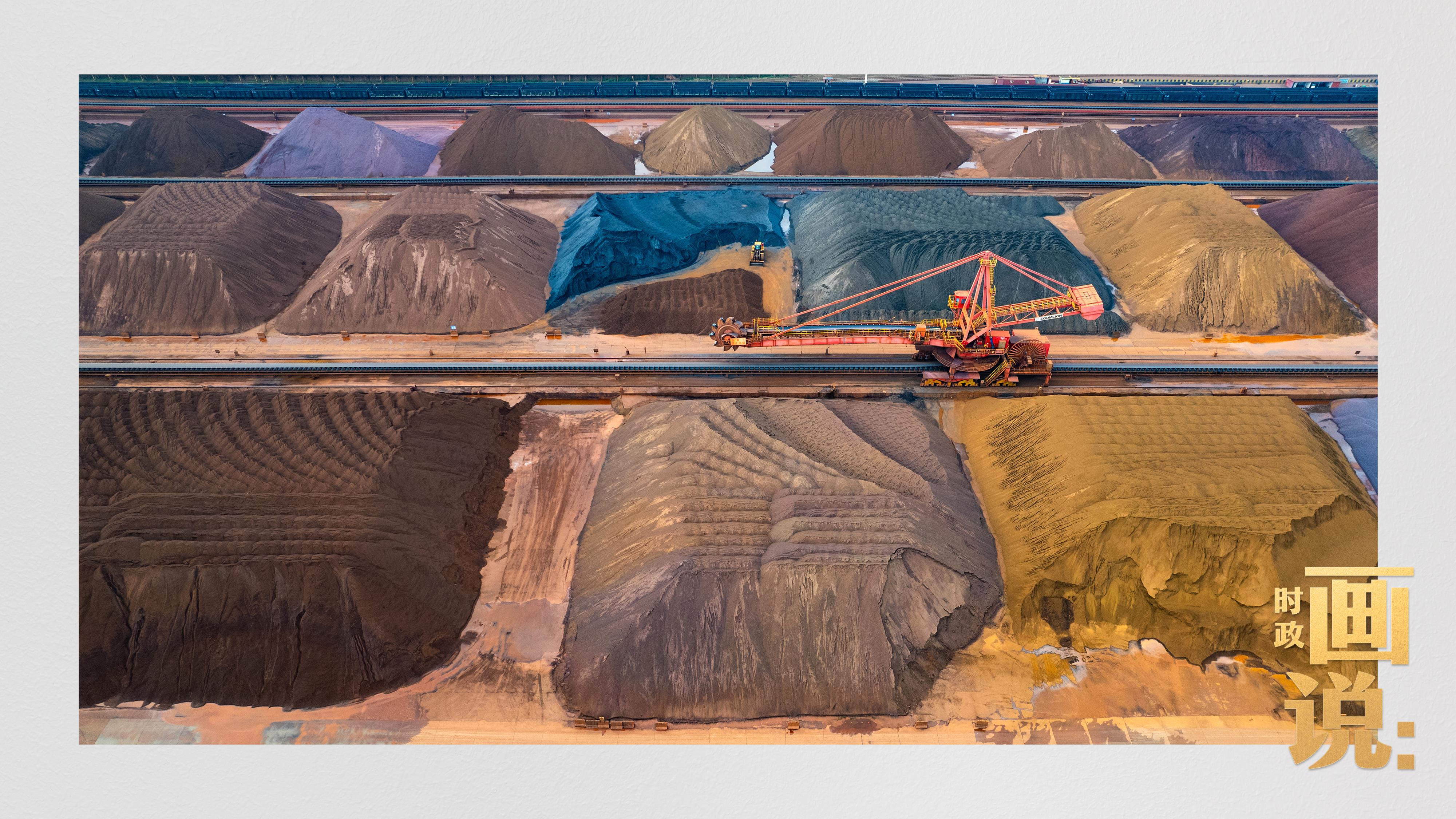 △港區(qū)內(nèi)的礦石堆場(chǎng)整理堆放著五顏六色的各類礦石、礦砂,宛如油畫。