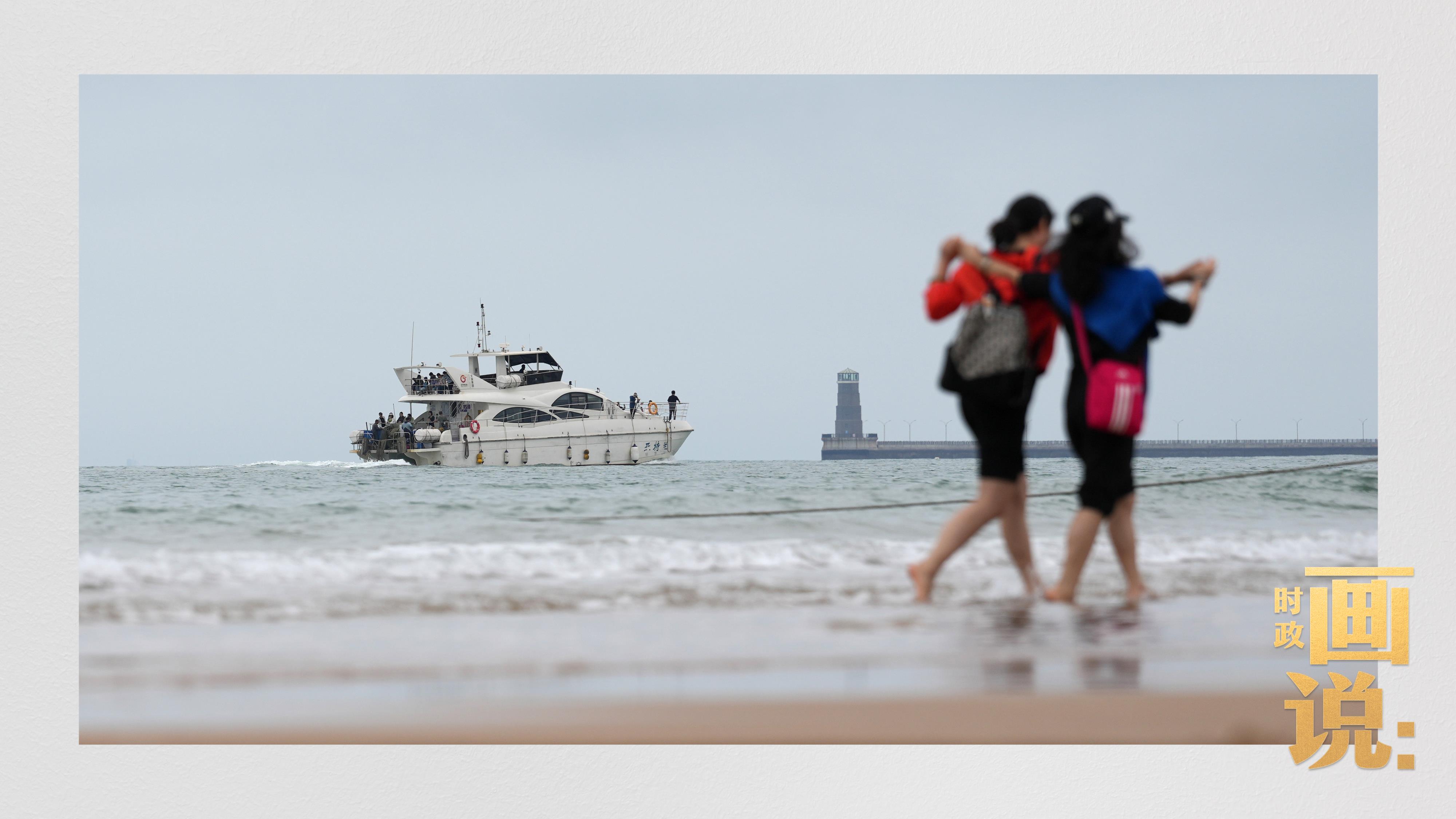 △日照陽光海岸綠道上的萬平口景區(qū),一對(duì)游客在海浪中翩然起舞。