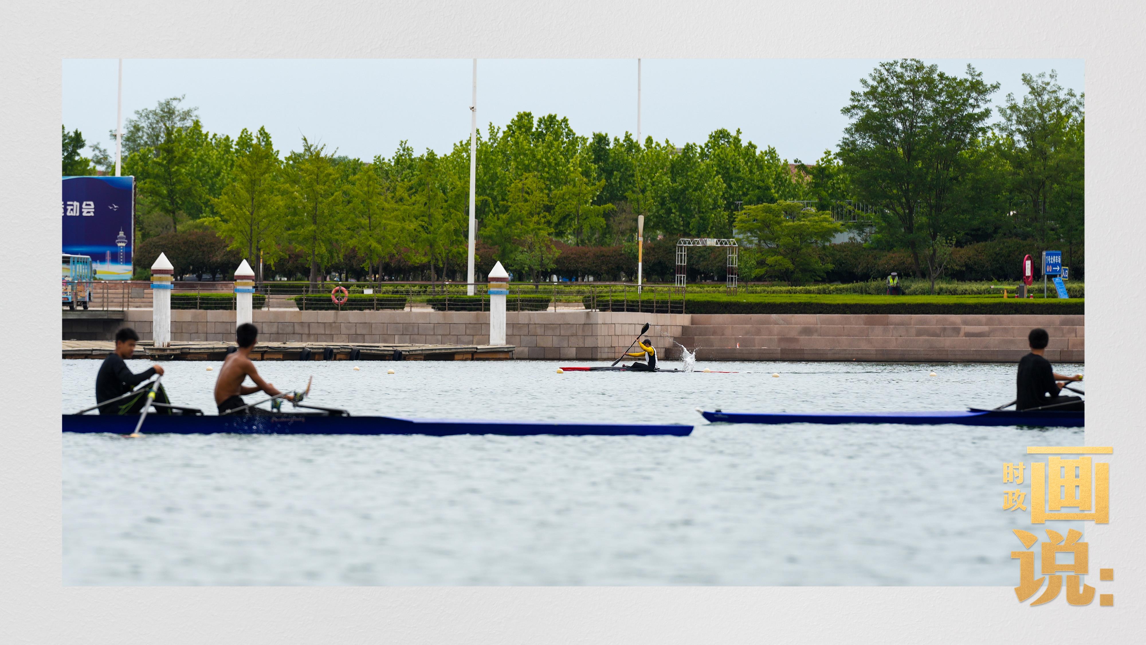 △奧林匹克水上公園碧波輕漾,皮劃艇運(yùn)動(dòng)員正在訓(xùn)練。