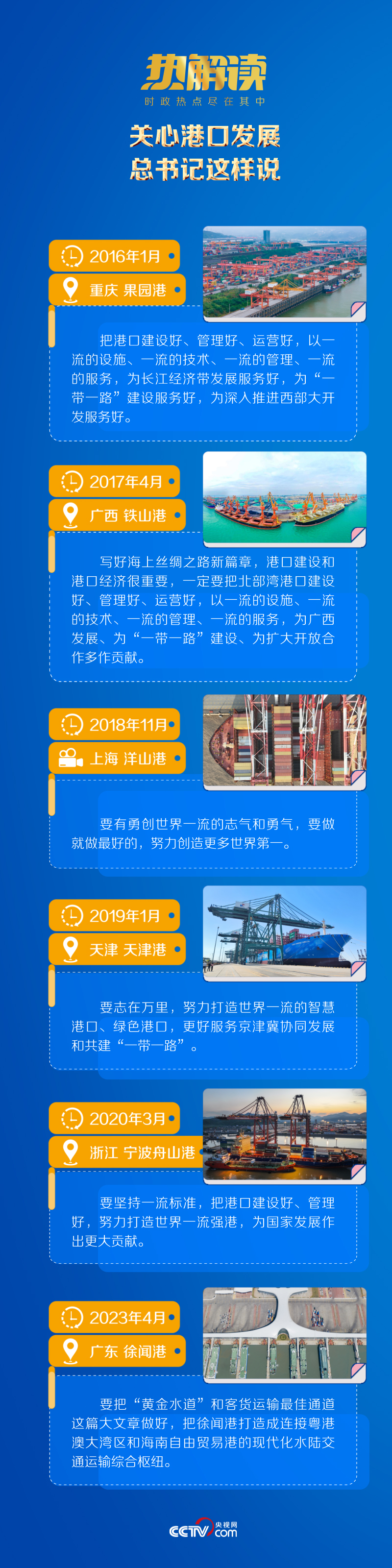 從內(nèi)河航運(yùn)的黃金水道到國際航運(yùn)的港通四海,總書記多次在考察行程中關(guān)注我國沿海沿江港口建設(shè),精心謀劃推進(jìn)世界一流強(qiáng)港建設(shè)工作。