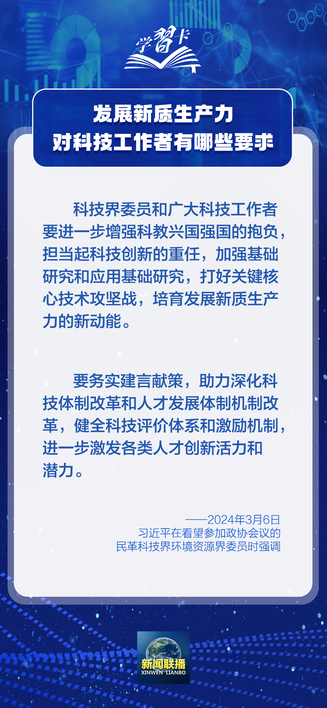 2024年5月30日是第八個“全國科技工作者日”。實現(xiàn)科技自立自強、建設(shè)世界科技強國,廣大科技工作者責(zé)任重大、使命光榮。培育發(fā)展新質(zhì)生產(chǎn)力的新動能,廣大科技工作者可以怎么做?習(xí)近平總書記的一系列論述指明了方向。一起學(xué)習(xí)↓↓↓