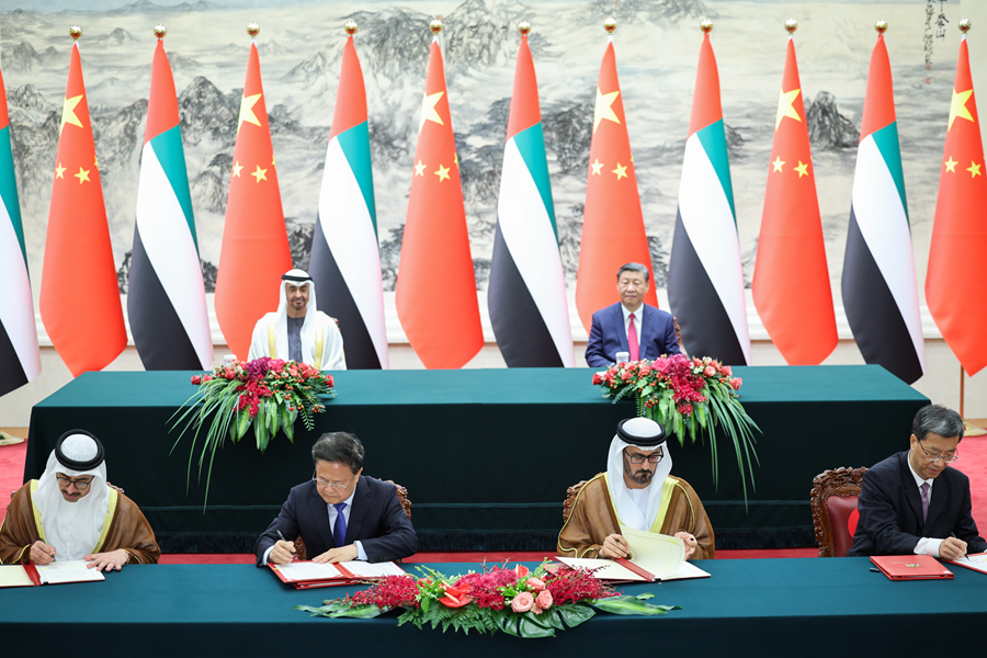 5月30日下午,國(guó)家主席習(xí)近平在北京人民大會(huì)堂同來(lái)華國(guó)事訪問并出席中國(guó)-阿拉伯國(guó)家合作論壇第十屆部長(zhǎng)級(jí)會(huì)議開幕式的阿聯(lián)酋總統(tǒng)穆罕默德舉行會(huì)談。這是會(huì)談后,兩國(guó)元首共同見證簽署多項(xiàng)雙邊合作文件。新華社記者 劉彬 攝