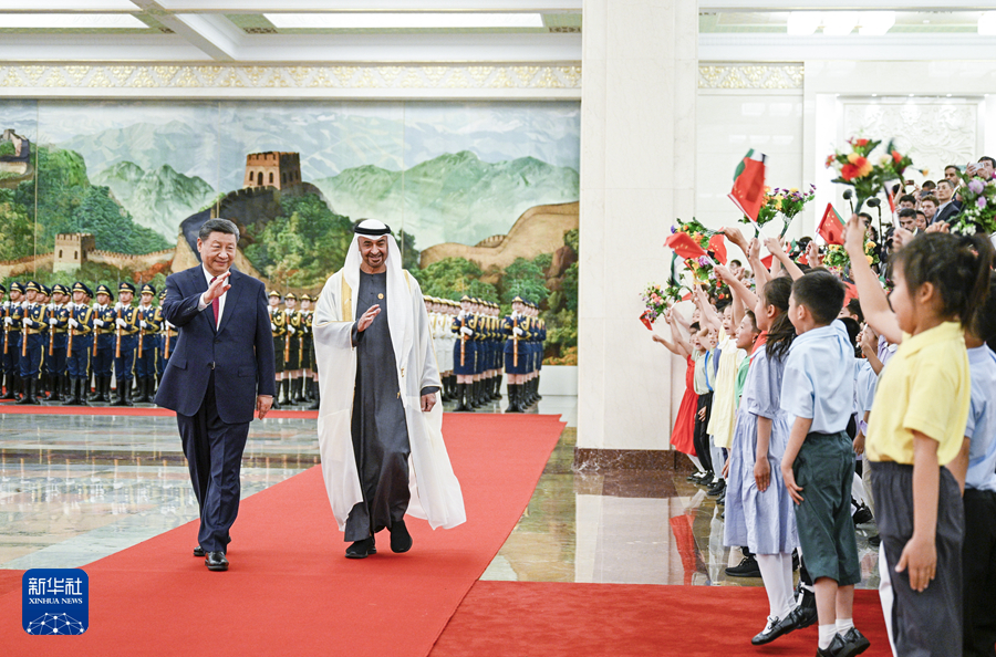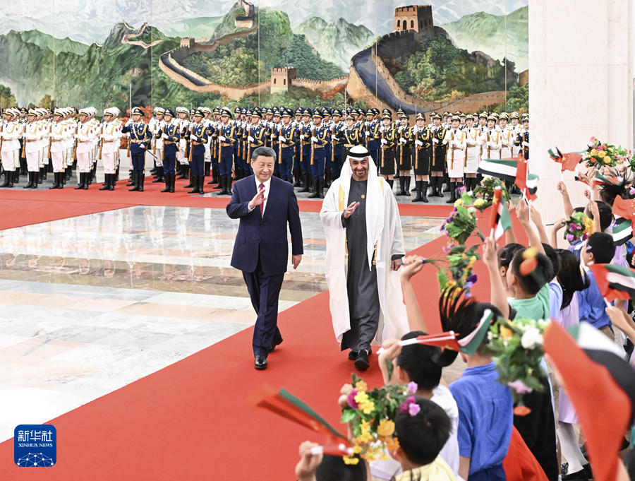 5月30日下午,國(guó)家主席習(xí)近平在北京人民大會(huì)堂同來(lái)華國(guó)事訪問并出席中國(guó)-阿拉伯國(guó)家合作論壇第十屆部長(zhǎng)級(jí)會(huì)議開幕式的阿聯(lián)酋總統(tǒng)穆罕默德舉行會(huì)談。這是會(huì)談前,習(xí)近平在人民大會(huì)堂北大廳為穆罕默德舉行歡迎儀式。新華社記者 饒愛民 攝