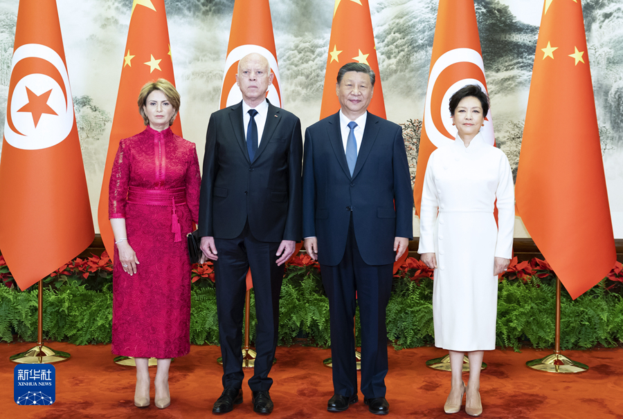 5月31日上午,國家主席習(xí)近平在北京人民大會(huì)堂同來華國事訪問并出席中國-阿拉伯國家合作論壇第十屆部長級(jí)會(huì)議開幕式的突尼斯總統(tǒng)賽義德舉行會(huì)談。這是會(huì)談前,習(xí)近平和夫人彭麗媛同賽義德和夫人伊什拉芙合影。新華社記者 黃敬文 攝