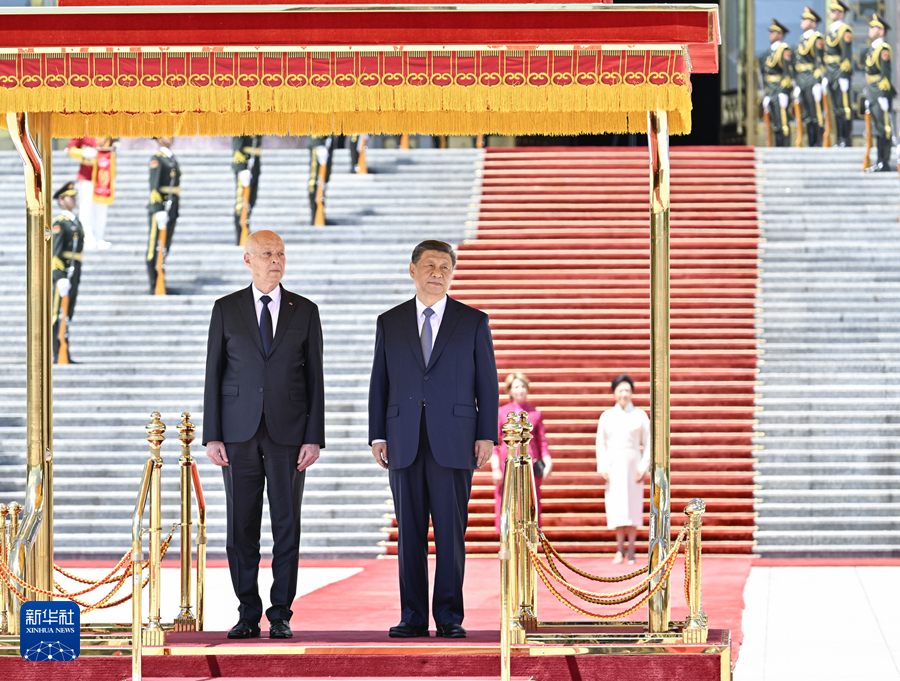 5月31日上午,國家主席習(xí)近平在北京人民大會(huì)堂同來華國事訪問并出席中國-阿拉伯國家合作論壇第十屆部長級(jí)會(huì)議開幕式的突尼斯總統(tǒng)賽義德舉行會(huì)談。這是會(huì)談前,習(xí)近平在人民大會(huì)堂東門外廣場為賽義德舉行歡迎儀式。新華社記者 黃敬文 攝