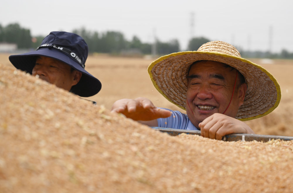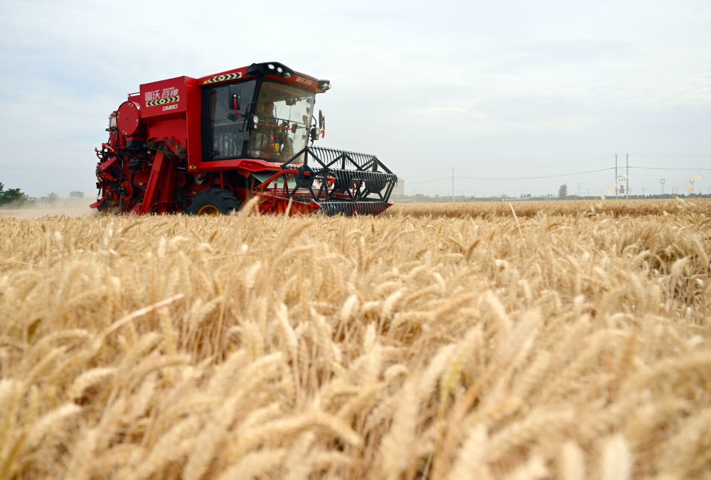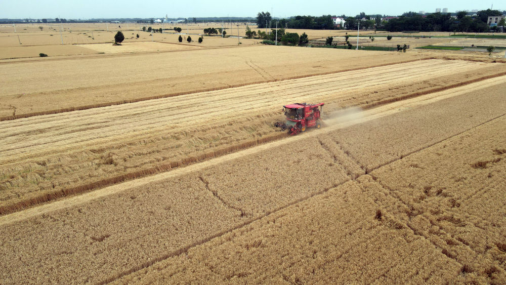 麥?zhǔn)諘r(shí)節(jié),在安徽阜陽(yáng)太和縣,機(jī)器轟鳴,麥浪翻滾如金色綢緞,飽滿(mǎn)的麥粒裝滿(mǎn)一輛輛運(yùn)糧車(chē)的貨廂。