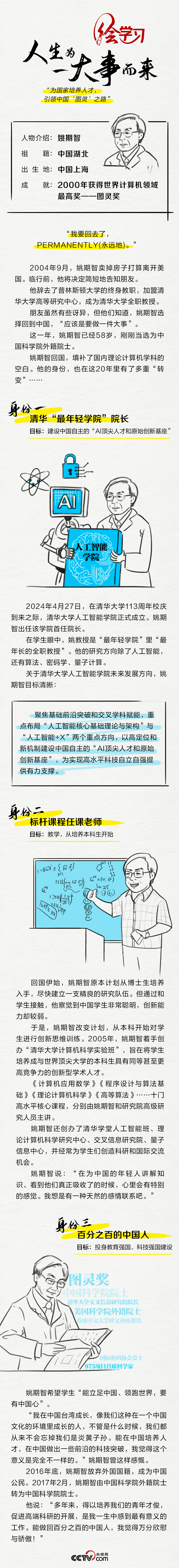 作為一名計(jì)算機(jī)科學(xué)專家,姚期智是圖靈獎(jiǎng)創(chuàng)立以來首位亞裔獲獎(jiǎng)?wù)撸彩鞘澜绗F(xiàn)代密碼學(xué)基礎(chǔ)的奠基人之一。2004年,姚期智辭去美國(guó)普林斯頓大學(xué)終身教職,回國(guó)到清華大學(xué)全職任教。他曾說,“人生為一大事而來”。這件大事,就是“為國(guó)家培養(yǎng)人才,引領(lǐng)中國(guó)‘圖靈’之路”。央視網(wǎng)《天天學(xué)習(xí)》欄目推出手繪長(zhǎng)圖,為您講述姚期智將愛國(guó)之情化為報(bào)國(guó)之行的奮斗故事。