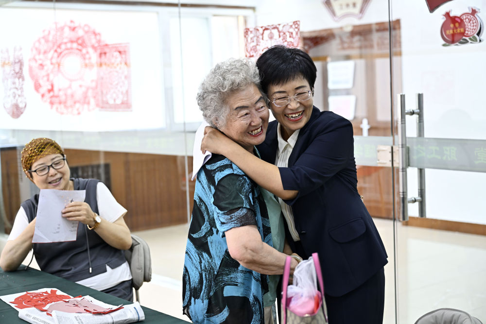 6月20日,寧夏銀川市金鳳區(qū)長城花園社區(qū)黨委書記趙耐香(右一)在社區(qū)“才藝堂”與居民交流。